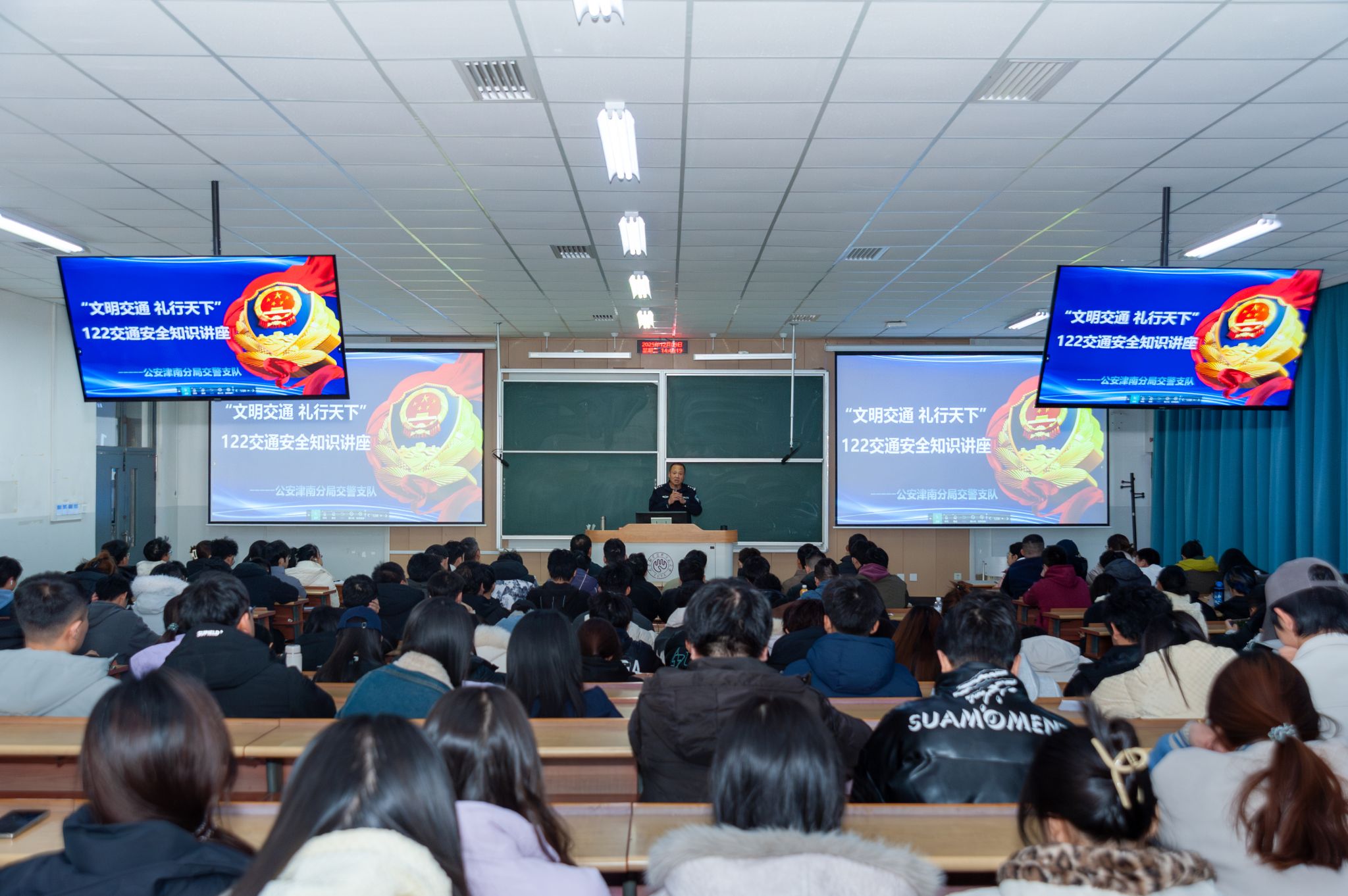 12月9日下午,我校特邀天津市公安局津南分局交管支队安全监管大队石伟警官,在第三教学楼102教室举办题为“文明交通 礼行天下-知危险会避险”的交通安全讲座。讲座由党委安全工作部部长李凤国主持,200余名师生现场聆听。